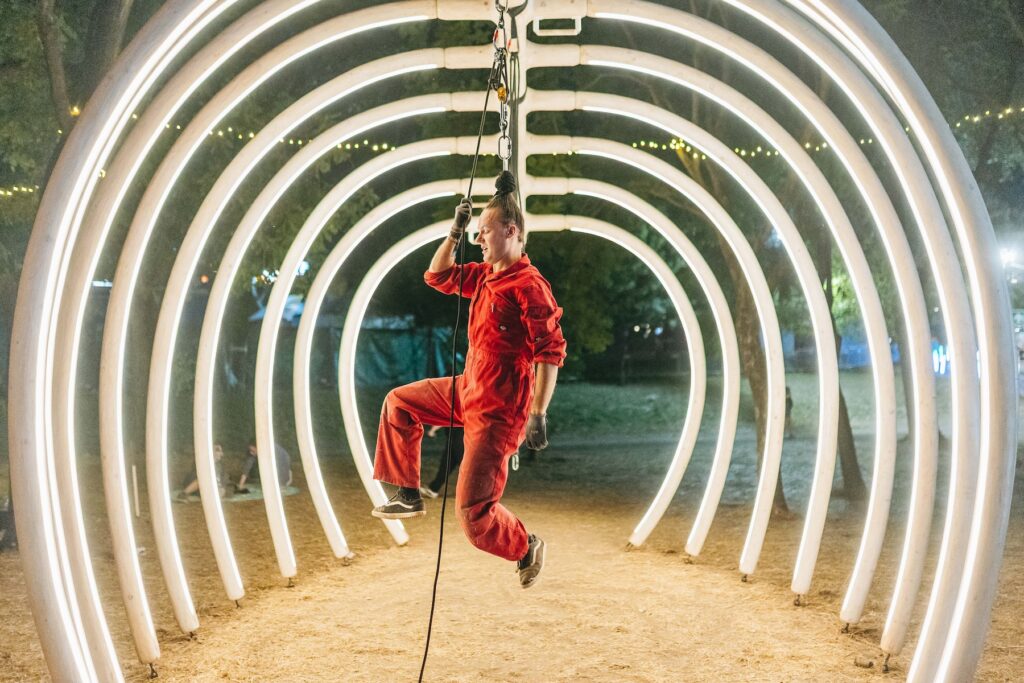 Expect to play Nokia’s snake in smoke with your feet at 3am with strangers. Expect to open a portaloo and be met with an art installation. Expect to attend staged debates on the morality of males opening doors for females. Or performers dressed as giraffes roaming the streets.
